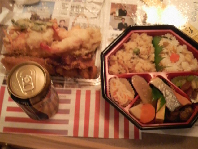 夕方セールで左側の天ぷらが半額525円。右側の弁当が100円引き563円。