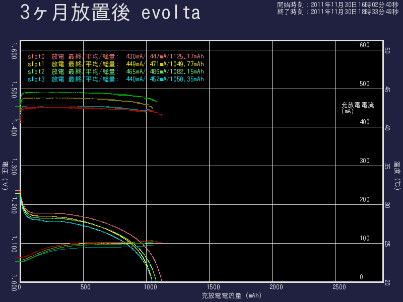 経年劣化かな。 それ以前に買って、この電池以上に酷使してる、eneloopは、全然大丈夫なのに、 てな結果は次の放電実験で、出ます。生中継中を仕込みました。(今朝の6:35から、実施でシェルを書いてます。) この結果だけ見ると、evoltaは、本当にJIS C8708の試験を誠実にやってるのか疑問になる、てな感じになっちゃうけどなあ。 |